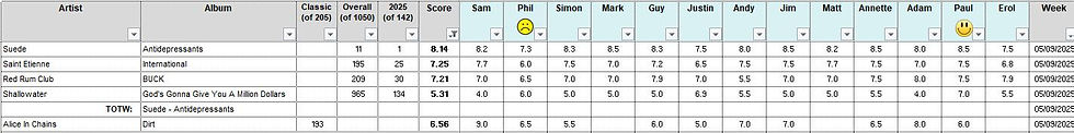 Suede: wouldn't consider myself the biggest Suede fan but this is tremendous - the Cure/Siouxsie-style gothic guitars are fantastic and there's no let up in the quality across the whole album. Not many of the early '90s intake can still be sounding this good 30+ years on. 8.3